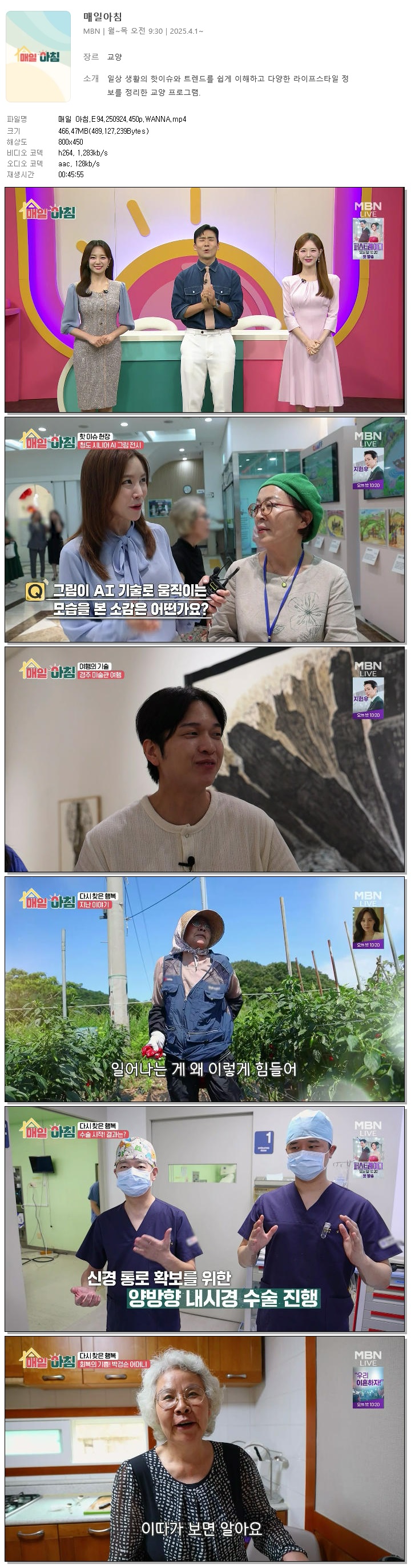 | [MBN] 매일 아침.E94.250924.450p.WANNA[한혜원, 이정수].mp4 | 466.5 M | 00:45:55 | 800x450 |