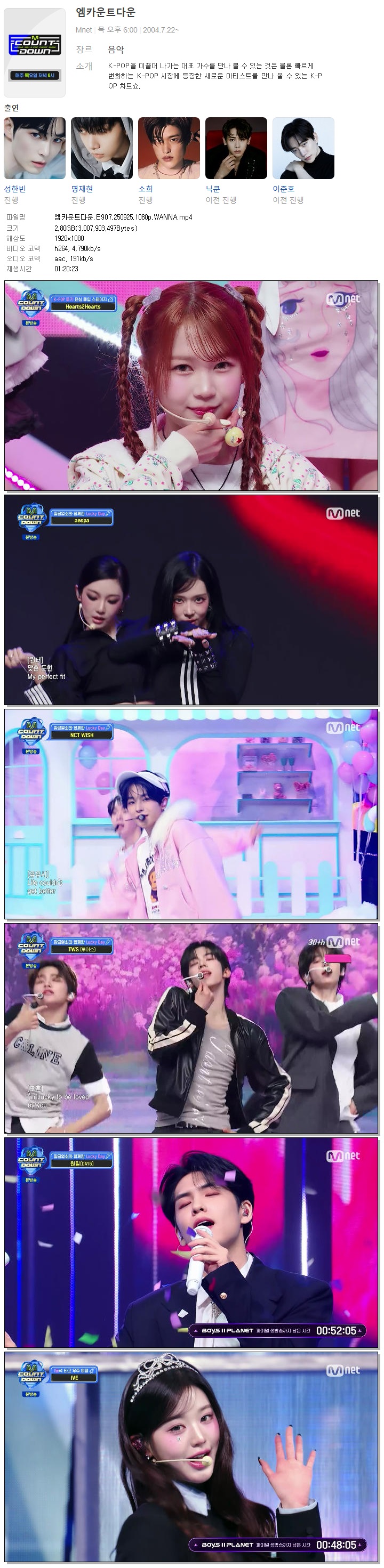 | [M.net] 엠카운트다운.E907.250925.1080p.WANNA[아일릿, 세븐틴].mp4 | 2.8 G | 01:20:23 | 1920x1080 |