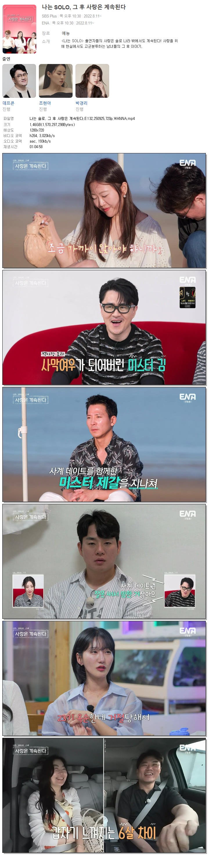 | [ENA] 나는 솔로, 그 후 사랑은 계속된다.E132.250925.720p.WANNA[경리, 보미].mp4 | 1.5 G | 01:04:58 | 1280x720 |