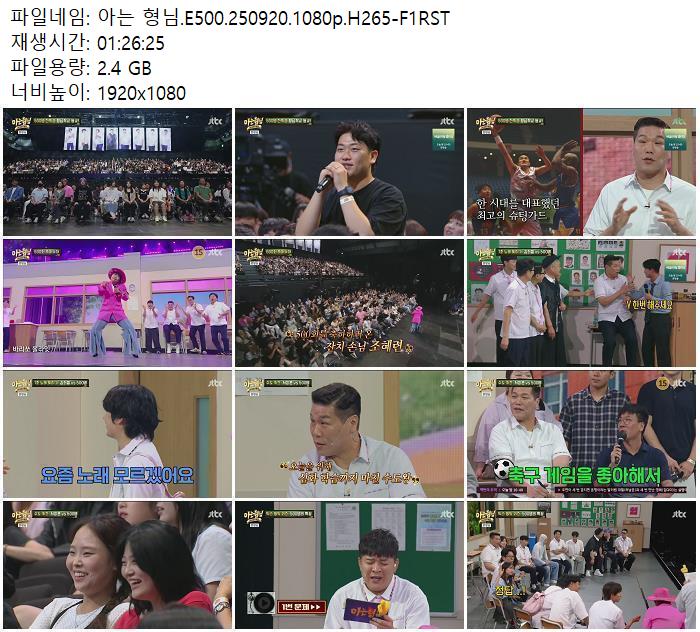 | 아는 형님.E500.250920.1080p.H265-F1RST.mp4 | 2.4 G | 01:26:00 | 1920x1080 |