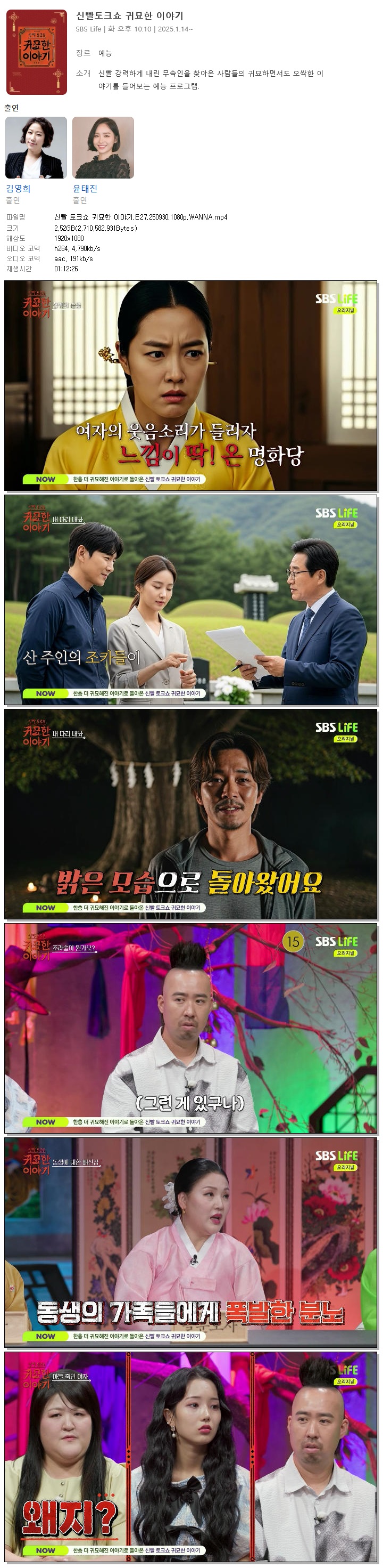 | [SBS LIFE] 신빨 토크쇼 귀묘한 이야기.E27.250930.1080p.WANNA[김소연, 유희관].mp4 | 2.5 G | 01:12:26 | 1920x1080 |