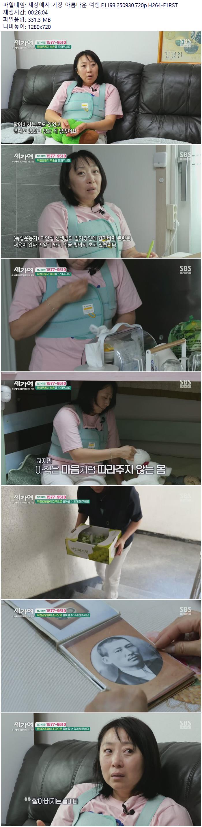 | 세상에서 가장 아름다운 여행.E1193.250930.720p.H264-F1RST.mp4 | 331.3 M | 00:26:04 | 1280x720 |