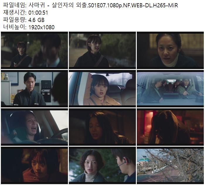 | 사마귀 - 살인자의 외출.S01E07.1080p.NF.WEB-DL.H265-MiR.mkv | 4.6 G | 01:00:00 | 1920x1080 |