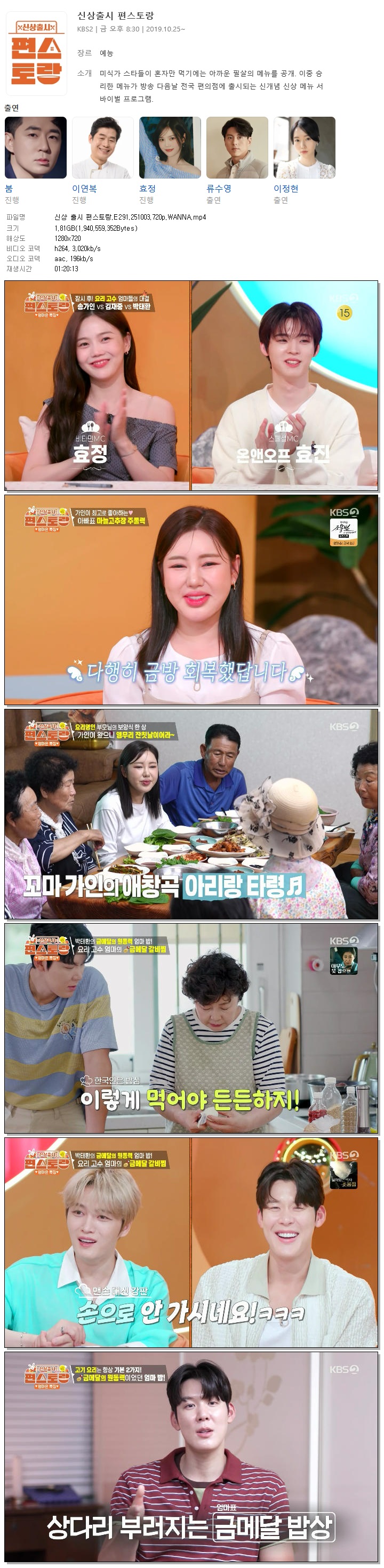 | [KBS2] 신상 출시 편스토랑.E291.251003.720p.WANNA[박태환, 송가인].mp4 | 1.8 G | 01:20:13 | 1280x720 |