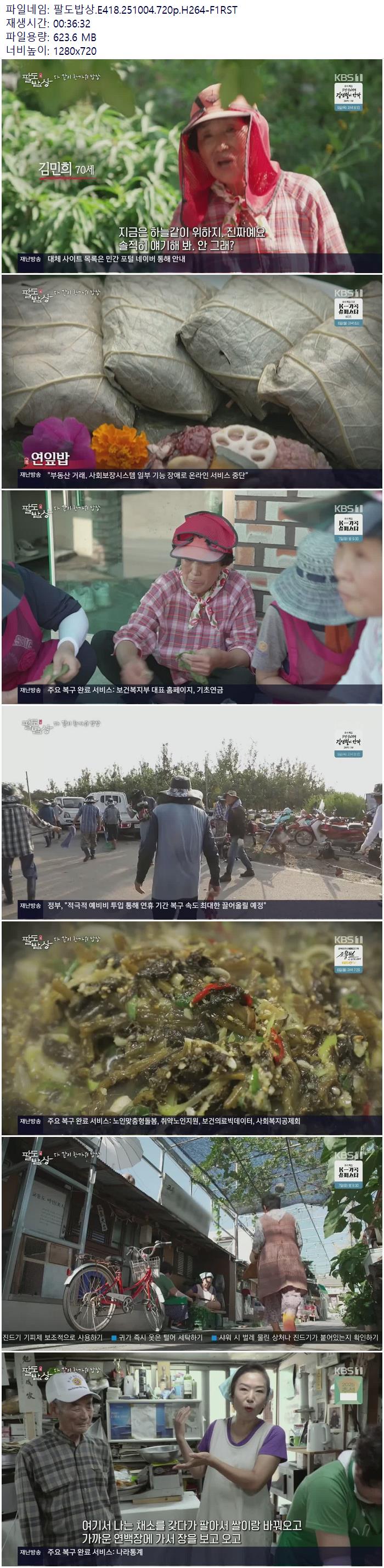 | 팔도밥상.E418.251004.720p.H264-F1RST.mp4 | 623.6 M | 00:36:32 | 1280x720 |