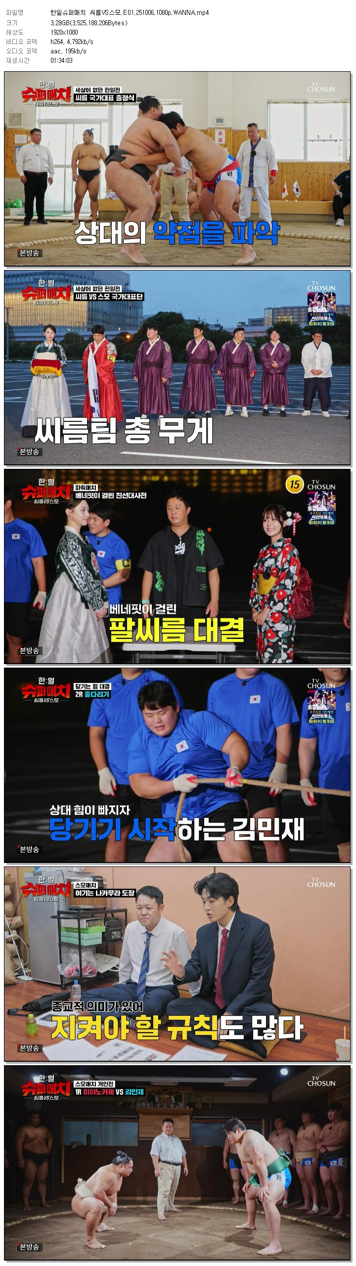 | [TV조선] 한일슈퍼매치 씨름VS스모.E01.251006.1080p.WANNA[김구라, 이태현].mp4 | 3.3 G | 01:34:03 | 1920x1080 |