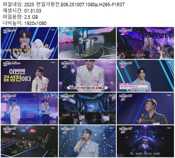 | 2025 한일가왕전.E06.251007.1080p.H265-F1RST.mp4 | 2.5 G | 01:31:00 | 1920x1080 |
