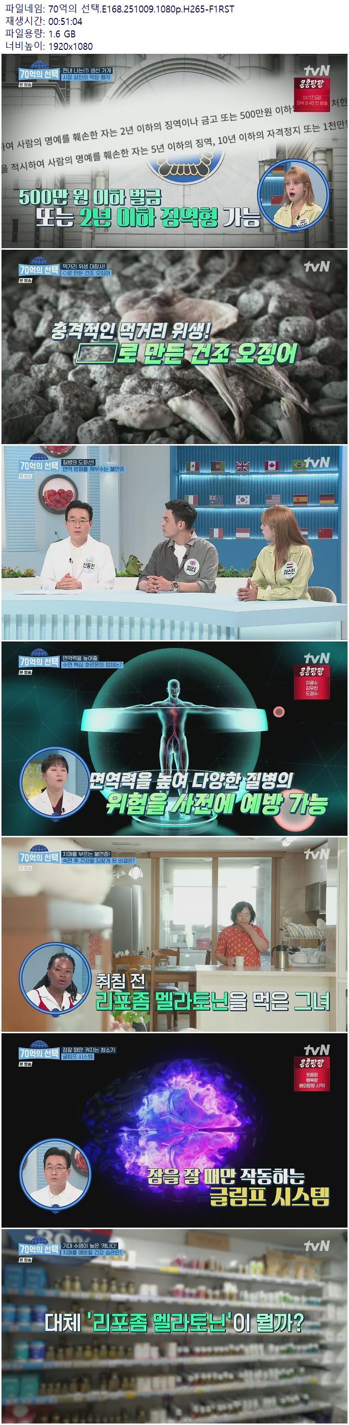 | 70억의 선택.E168.251009.1080p.H265-F1RST.mp4 | 1.6 G | 00:51:04 | 1920x1080 |