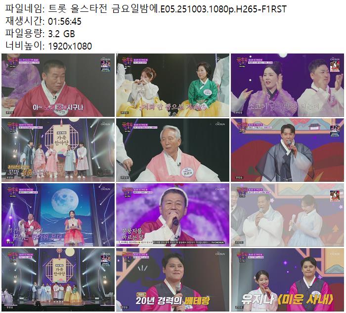 트롯 올스타전 금요일밤에.E05.251003.1080p.H265-F1RST.mp4 3.2 G 01:56:00 1920x1080