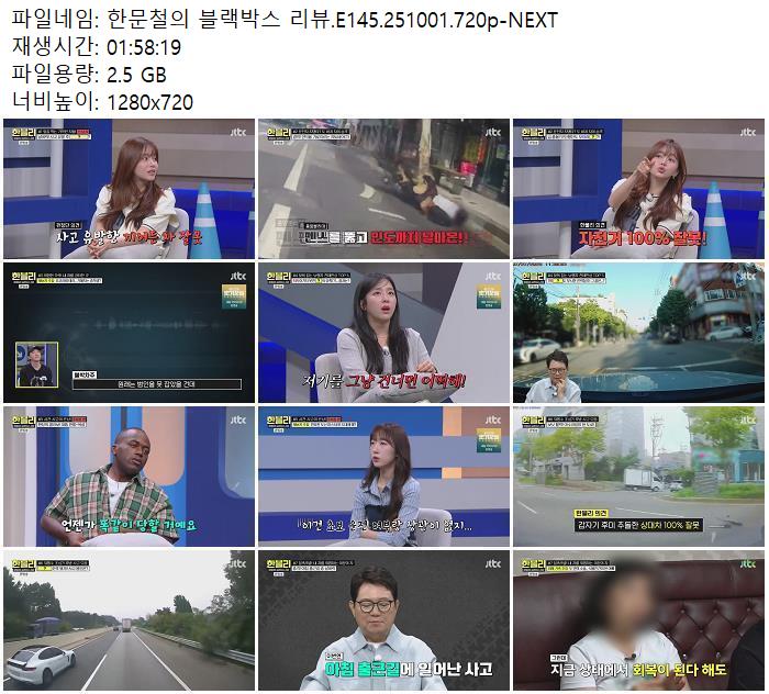 | 한문철의 블랙박스 리뷰.E145.251001.720p-NEXT.mp4 | 2.5 G | 01:58:00 | 1280x720 |