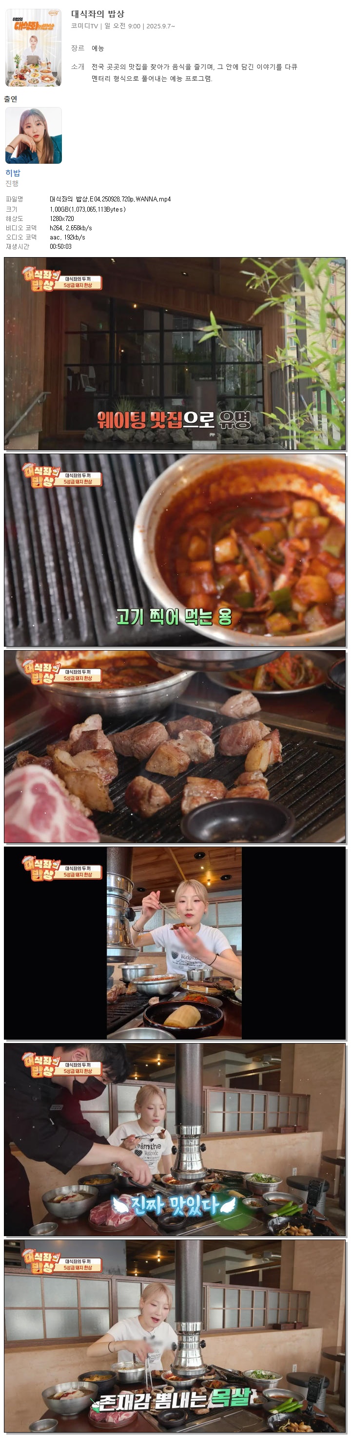 | [코미디TV] 대식좌의 밥상.E04.250928.720p.WANNA[히밥].mp4 | 1023.4 M | 00:50:03 | 1280x720 |