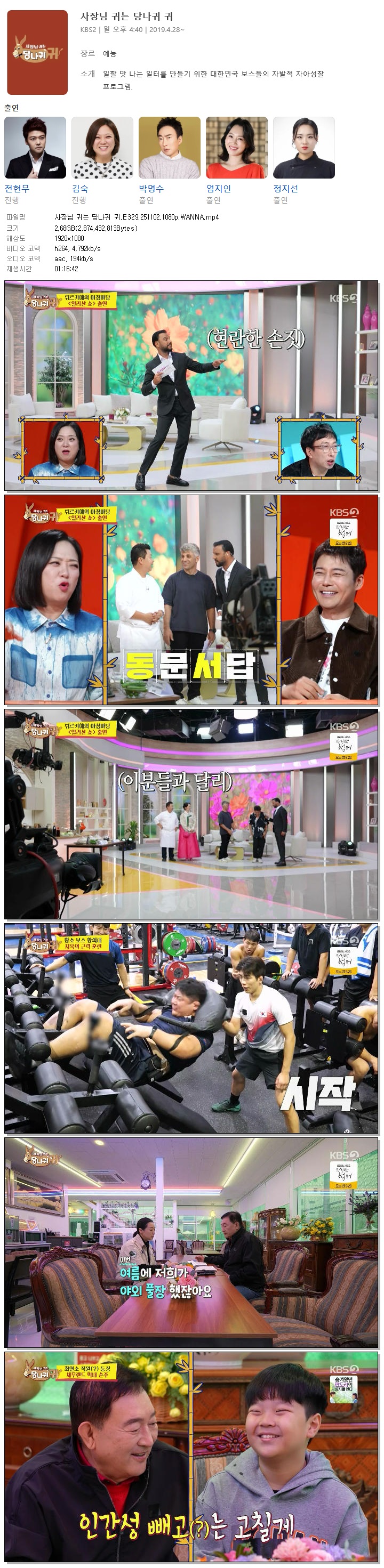 | [KBS2] 사장님 귀는 당나귀 귀.E329.251102.1080p.WANNA[전현무, 정호영].mp4 | 2.7 G | 01:16:42 | 1920x1080 |