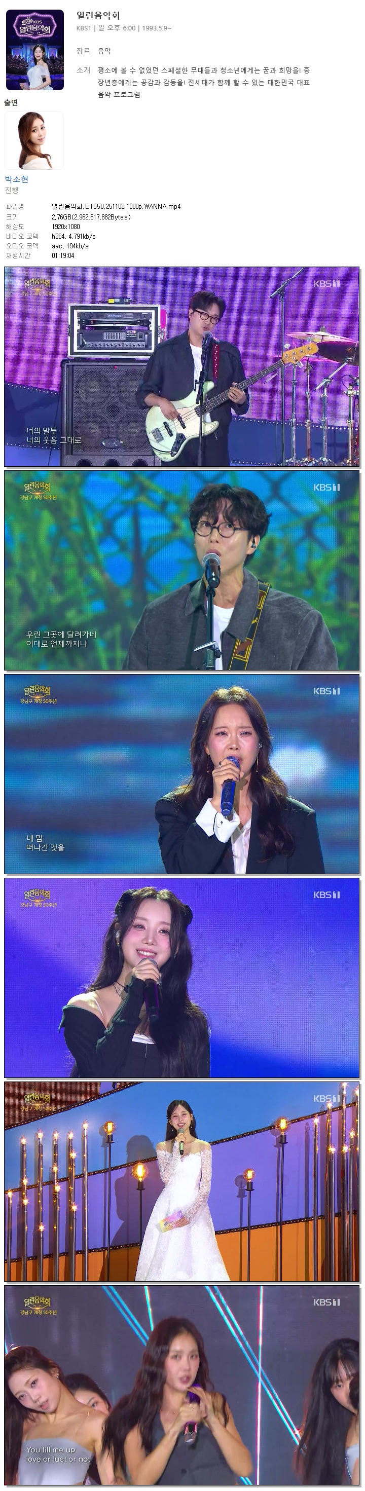| [KBS1] 열린음악회.E1550.251102.1080p.WANNA[백지영, 소유].mp4 | 2.8 G | 01:19:04 | 1920x1080 |