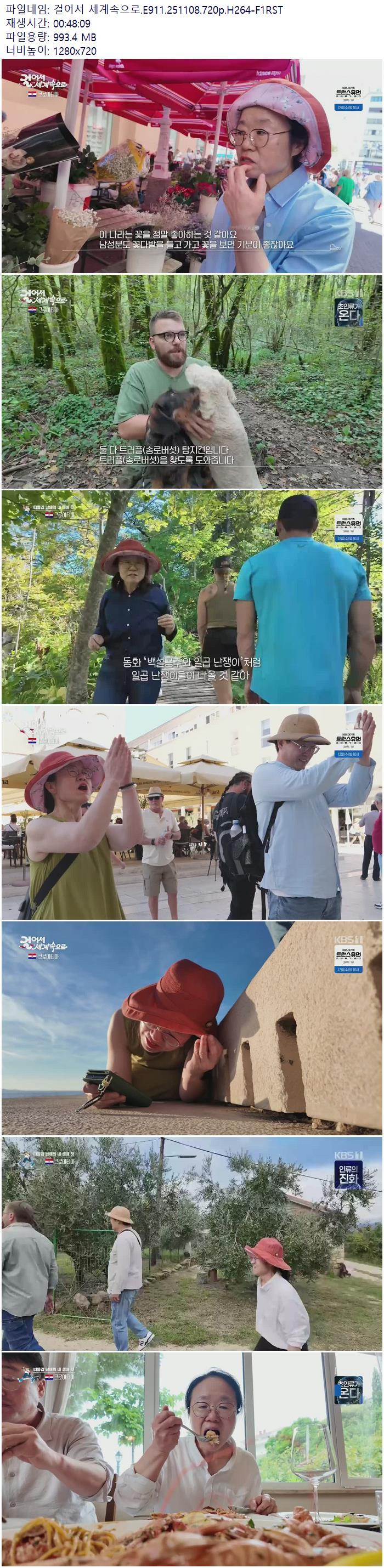 | 걸어서 세계속으로.E911.251108.720p.H264-F1RST.mp4 | 993.4 M | 00:48:09 | 1280x720 |