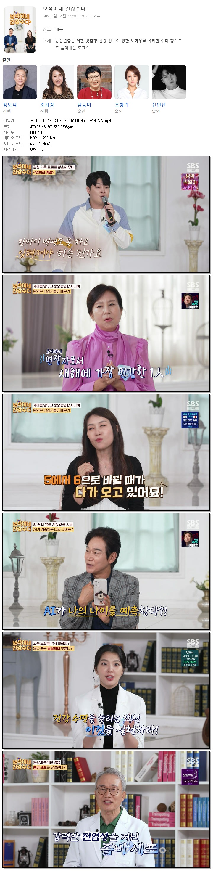 | [SBS] 보석이네 건강수다.E23.251110.450p.WANNA[정보석, 조갑경].mp4 | 479.3 M | 00:47:17 | 800x450 |