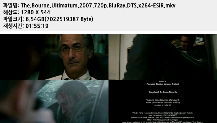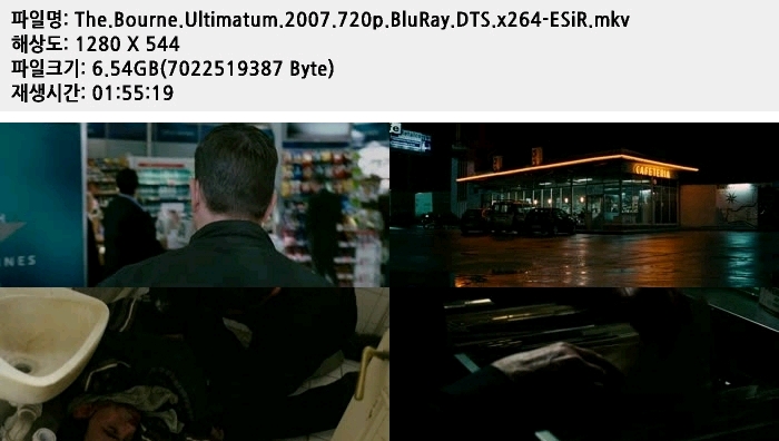 | The.Bourne.Ultimatum.2007.720p.BluRay.DTS.x264-ESiR.mkv | 6.5 G | 01:55:19 | 1280x720 |