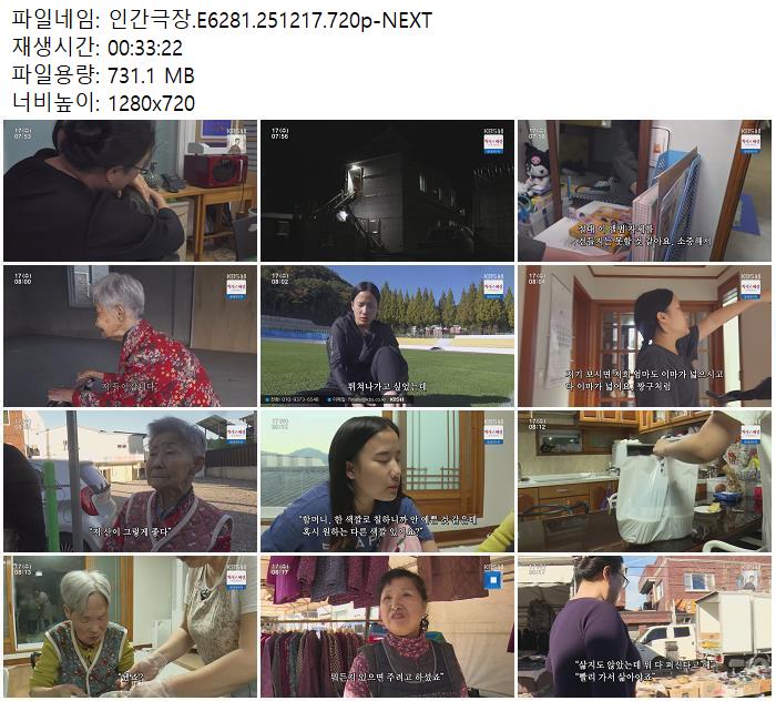 | 인간극장.E6281.251217.720p-NEXT.mp4 | 731.1 M | 00:33:22 | 1280x720 |