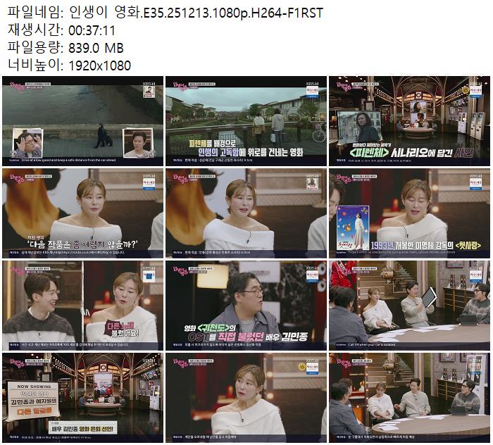 | 인생이 영화.E35.251213.1080p.H264-F1RST.mp4 | 839 M | 00:37:11 | 1920x1080 |