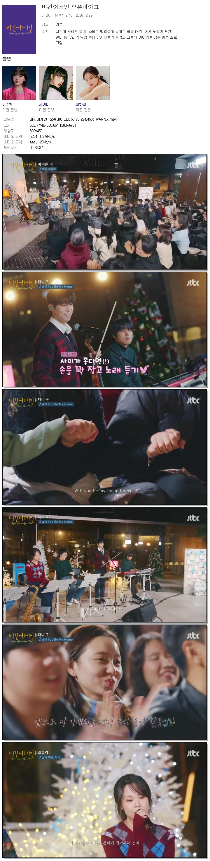 [JTBC] 비긴어게인 오픈마이크.E50.251224.450p.WANNA[대니 구, 제이슨 리].mp4 532.8 M 00:52:37 800x450