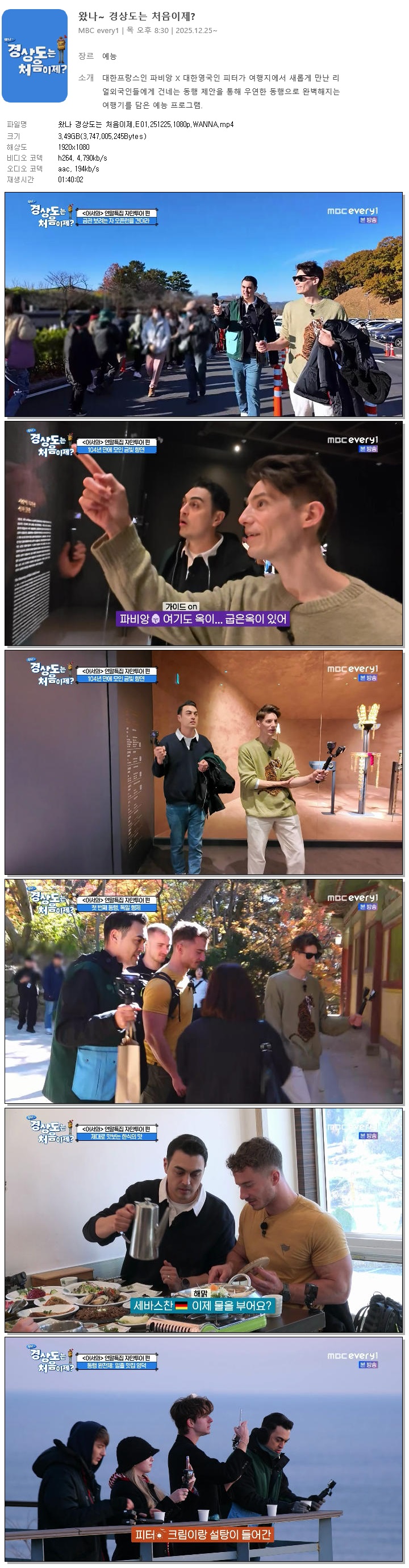 | [MBC Every1] 왔나 경상도는 처음이제.E01.251225.1080p.WANNA[파비앙, 피터].mp4 | 3.5 G | 01:40:02 | 1920x1080 |