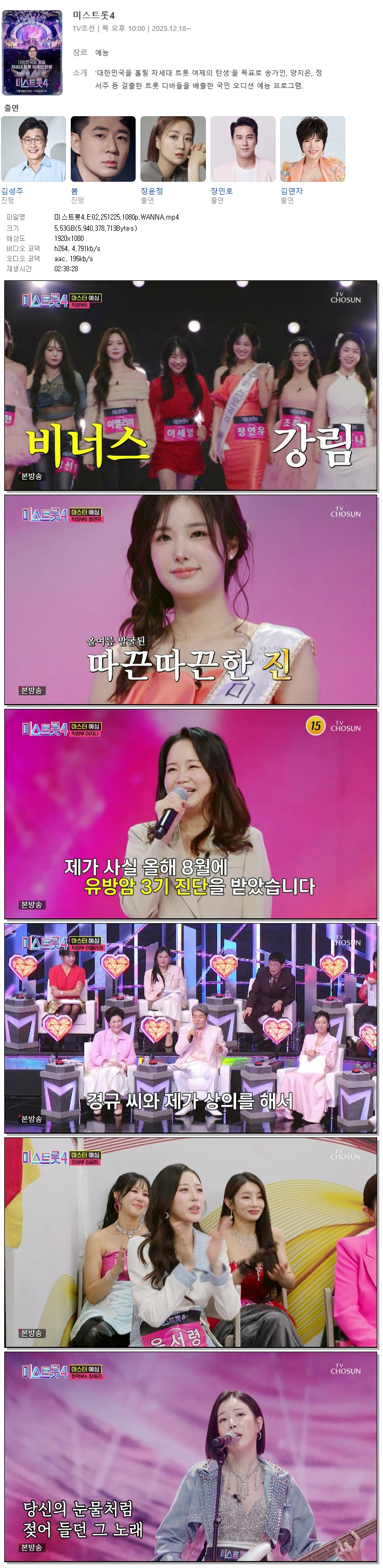 | [TV조선] 미스트롯4.E02.251225.1080p.WANNA[김용빈, 송가인].mp4 | 5.5 G | 02:38:28 | 1920x1080 |