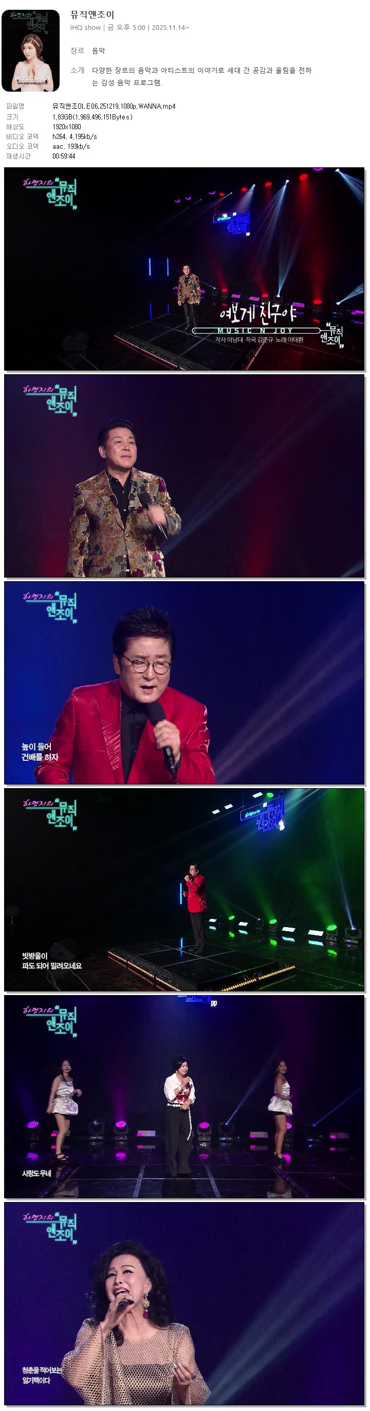 | [i SHOW] 뮤직앤조이.E06.251219.1080p.WANNA[하명지].mp4 | 1.8 G | 00:59:44 | 1920x1080 |