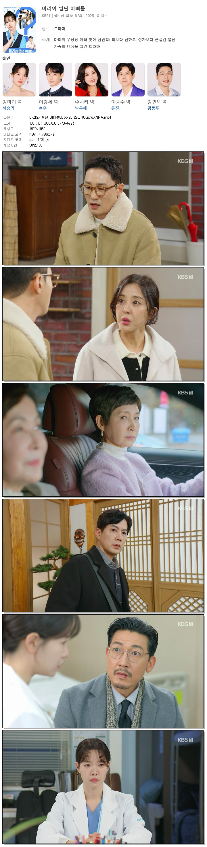 | [KBS1] 마리와 별난 아빠들.E55.251226.1080p.WANNA[하승리, 현우].mp4 | 1 G | 00:28:50 | 1920x1080 |