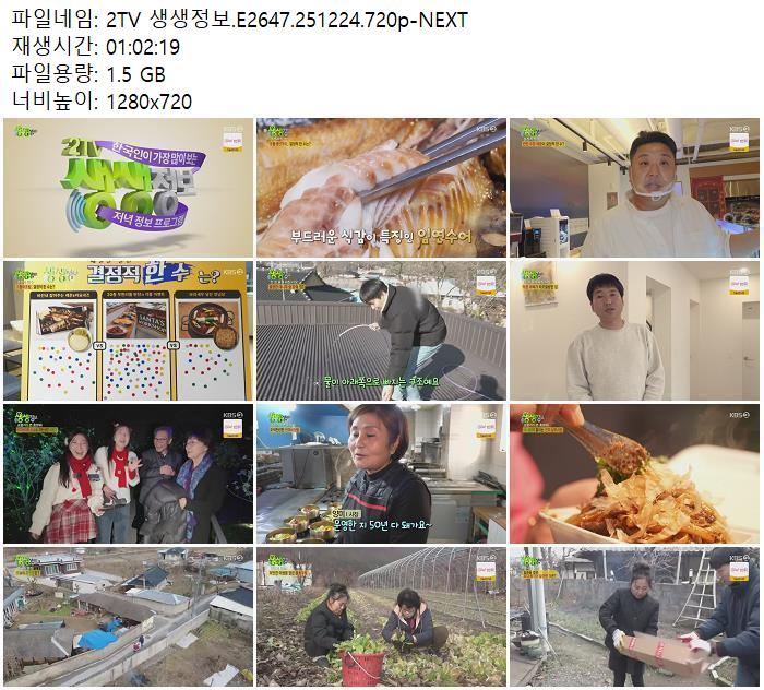 | 2TV 생생정보.E2647.251224.720p-NEXT.mp4 | 1.5 G | 01:02:00 | 1280x720 |