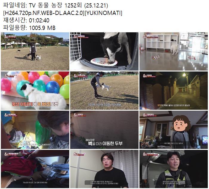 | TV 동물 농장 1252회 (25.12.21) [H264.720p.NF.WEB-DL.AAC.2.0][YUKINOMATI].mkv | 1005.9 M | 01:02:00 | 1280x720 |
