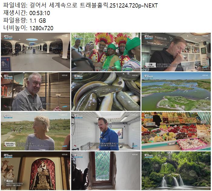 | 걸어서 세계속으로 트래블홀릭.251224.720p-NEXT.mp4 | 1.1 G | 00:53:10 | 1280x720 |