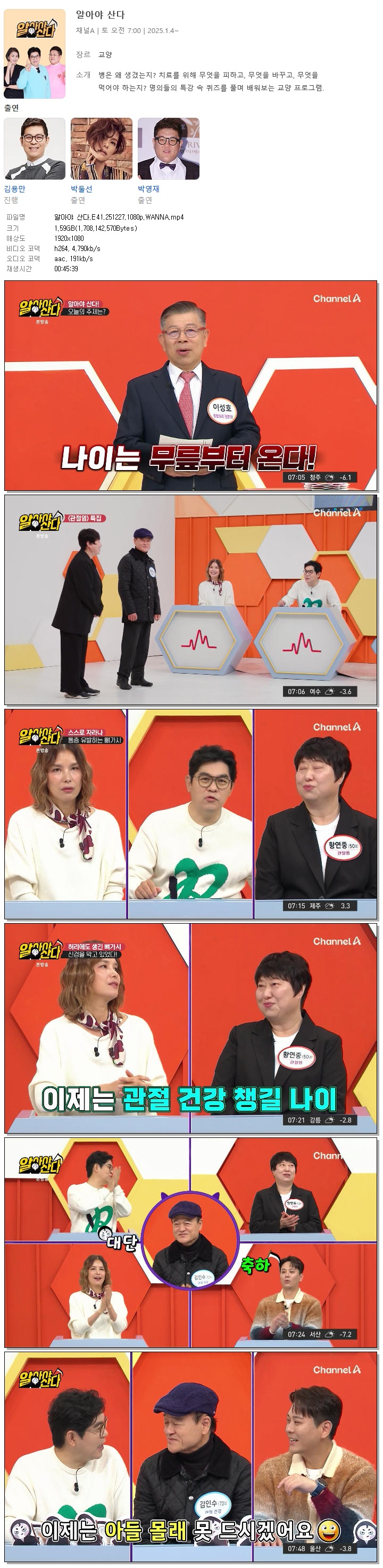 | [채널A] 알아야 산다.E41.251227.1080p.WANNA[김용만, 박둘선].mp4 | 1.6 G | 00:45:39 | 1920x1080 |