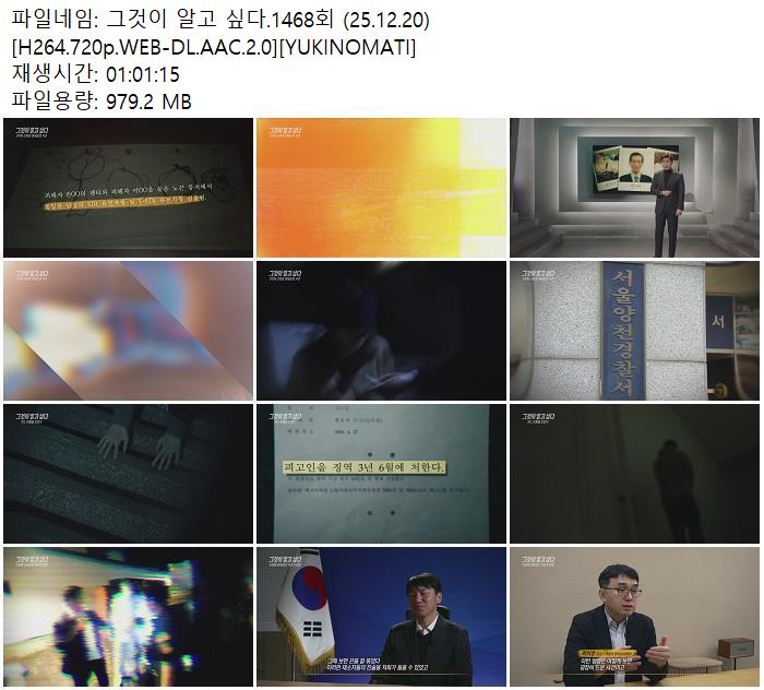 | 그것이 알고 싶다.1468회 (25.12.20) [H264.720p.WEB-DL.AAC.2.0][YUKINOMATI].mkv | 979.2 M | 01:01:00 | 1280x720 |