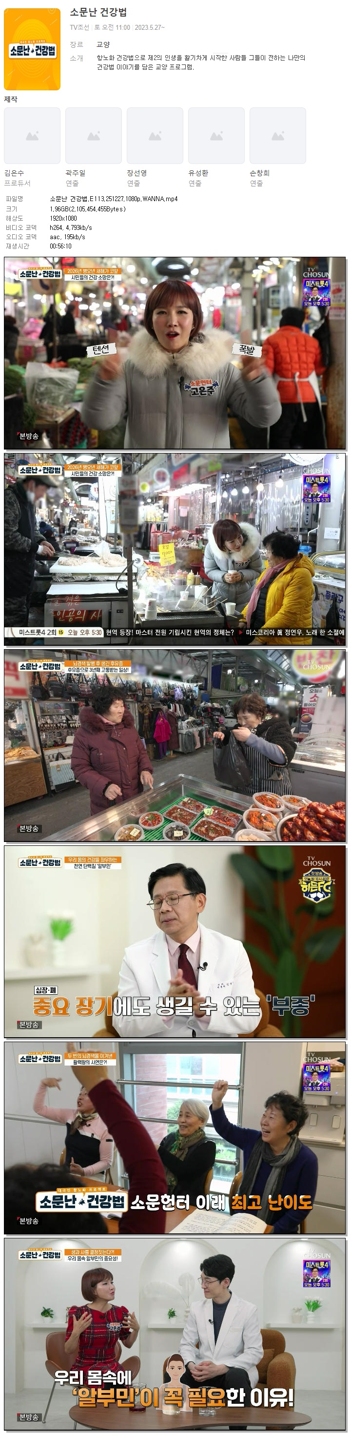 | [TV조선] 소문난 건강법.E113.251227.1080p.WANNA.mp4 | 2 G | 00:56:10 | 1920x1080 |