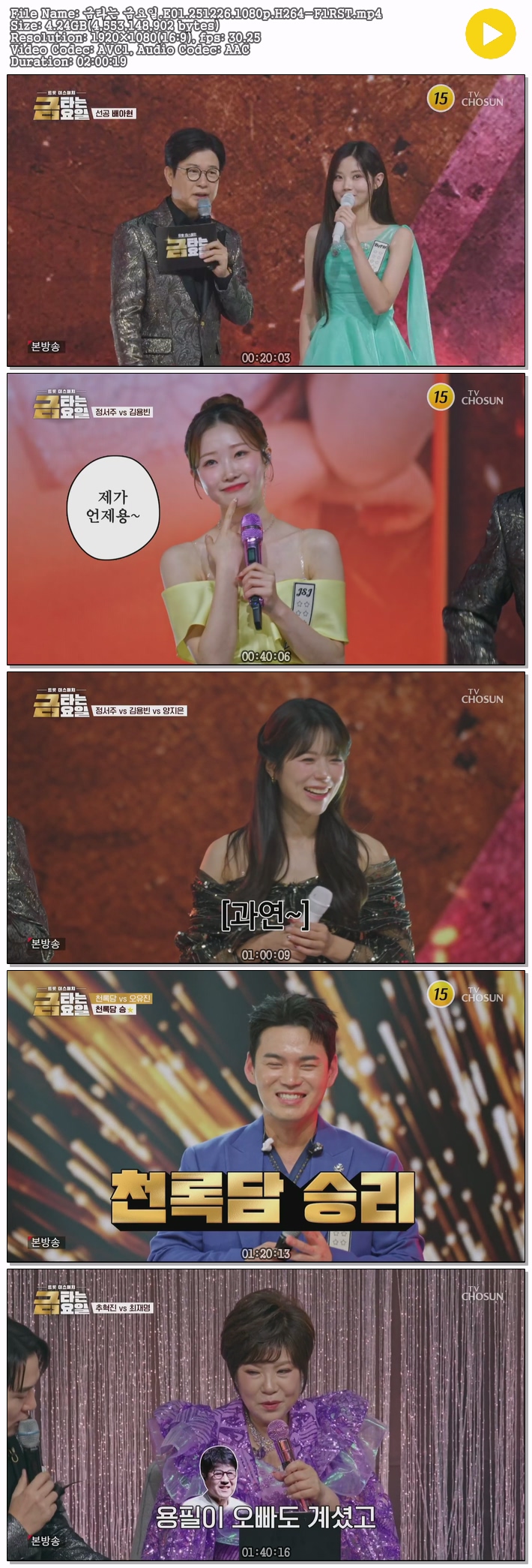 | 금타는 금요일.E01.251226.1080p.H264-F1RST.mp4 | 4.2 G | 02:00:19 | 1920x1080 |