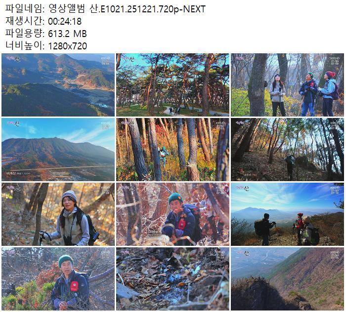 | 영상앨범 산.E1021.251221.720p-NEXT.mp4 | 613.2 M | 00:24:18 | 1280x720 |