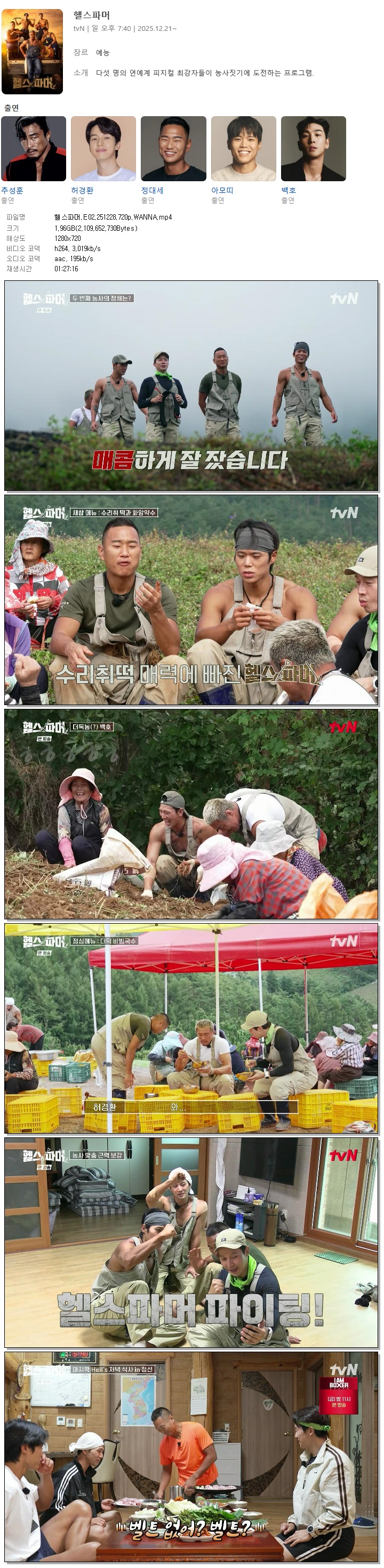 | [TVN] 헬스파머.E02.251228.720p.WANNA[추성훈, 허경환].mp4 | 2 G | 01:27:16 | 1280x720 |