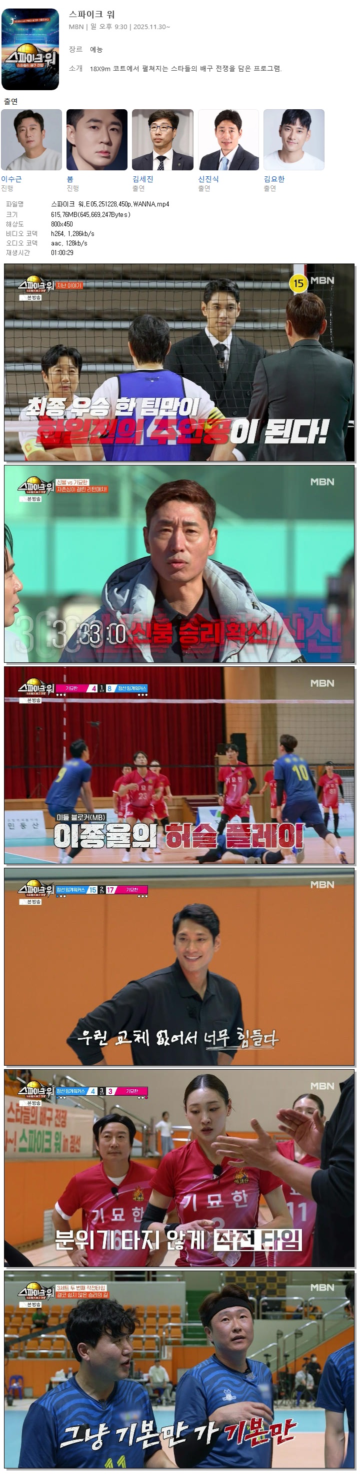 | [MBN] 스파이크 워.E05.251228.450p.WANNA[이수근, 김세진].mp4 | 615.8 M | 01:00:29 | 800x450 |