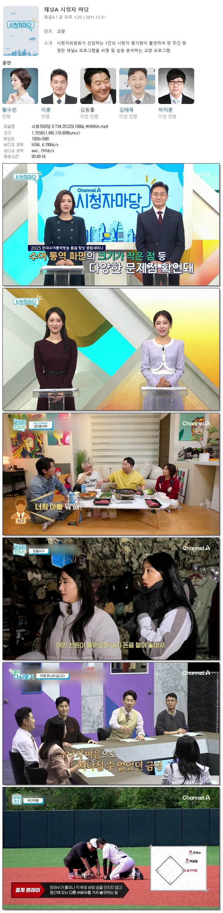 | [채널A] 시청자마당.E734.251229.1080p.WANNA[황수민, 이훈].mp4 | 1.7 G | 00:49:18 | 1920x1080 |