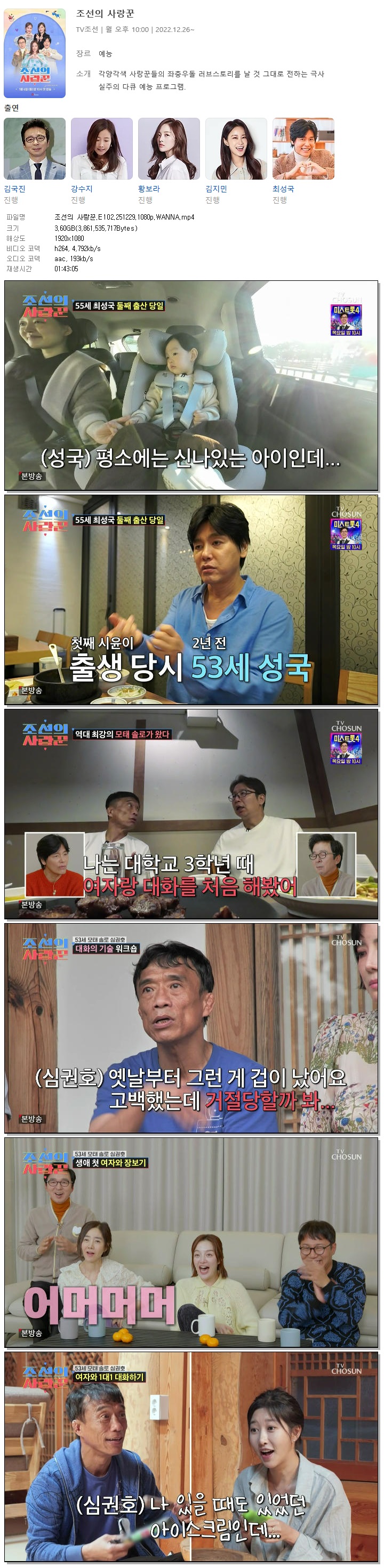 | [TV조선] 조선의 사랑꾼.E102.251229.1080p.WANNA[심권호, 심현섭].mp4 | 3.6 G | 01:43:05 | 1920x1080 |