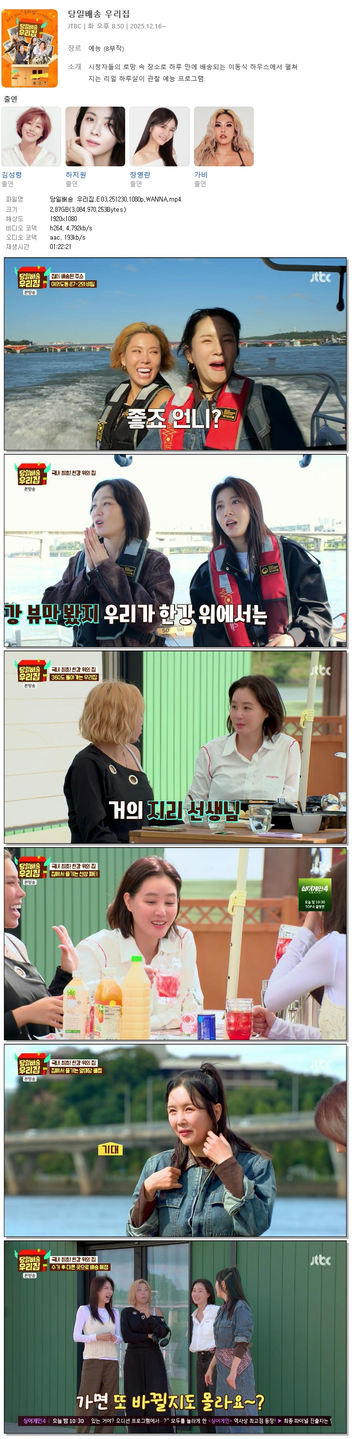 | [JTBC] 당일배송 우리집.E03.251230.1080p.WANNA[장영란, 가비].mp4 | 2.9 G | 01:22:21 | 1920x1080 |
