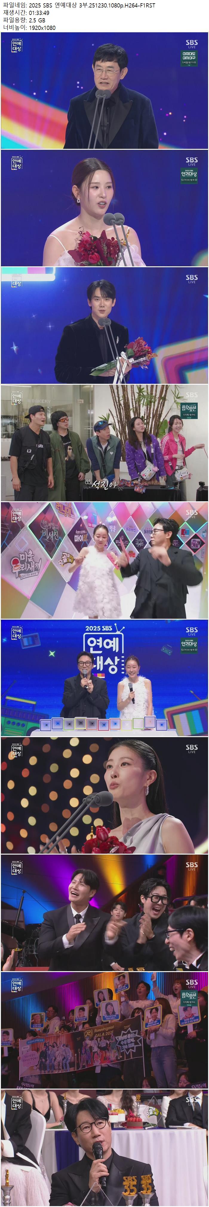 | 2025 SBS 연예대상 3부.251230.1080p.H264-F1RST.mp4 | 2.5 G | 01:33:49 | 1920x1080 |
