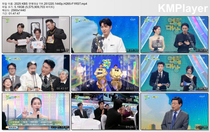 | 2025 KBS 연예대상 1부.251220.1440p.H265-F1RST.mp4 | 5.2 G | 01:47:00 | 2560x1440 |