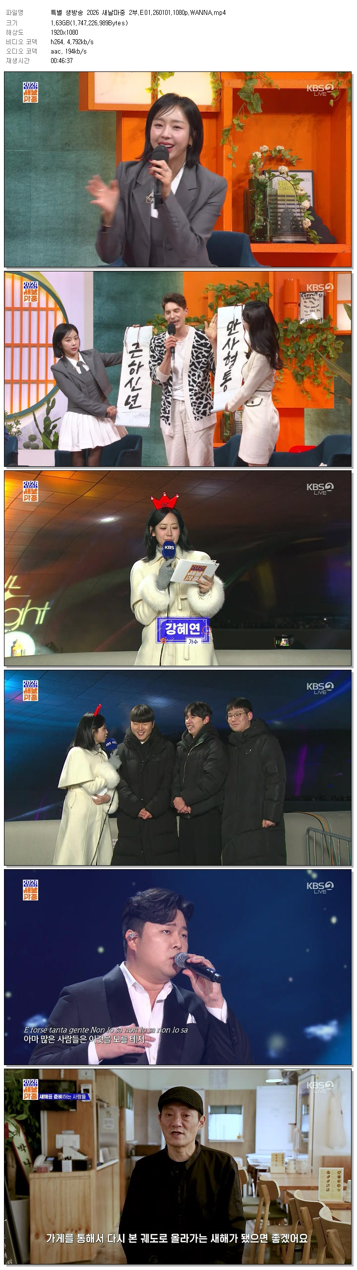 | [KBS2] 특별 생방송 2026 새날마중 2부.E01.260101.1080p.WANNA.mp4 | 1.6 G | 00:46:37 | 1920x1080 |