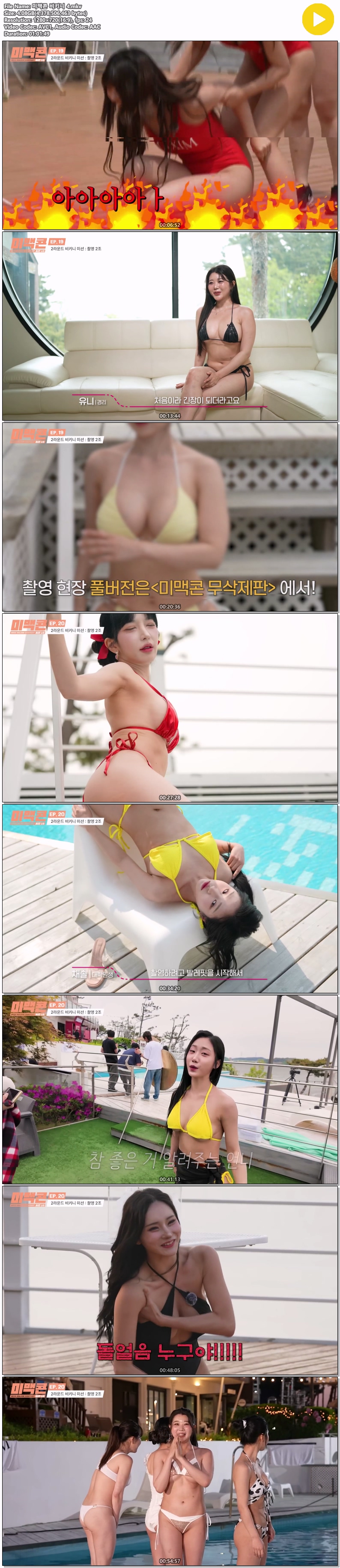 | 미맥콘 비키니 4.mkv | 4.1 G | 01:01:49 | 1280x720 |