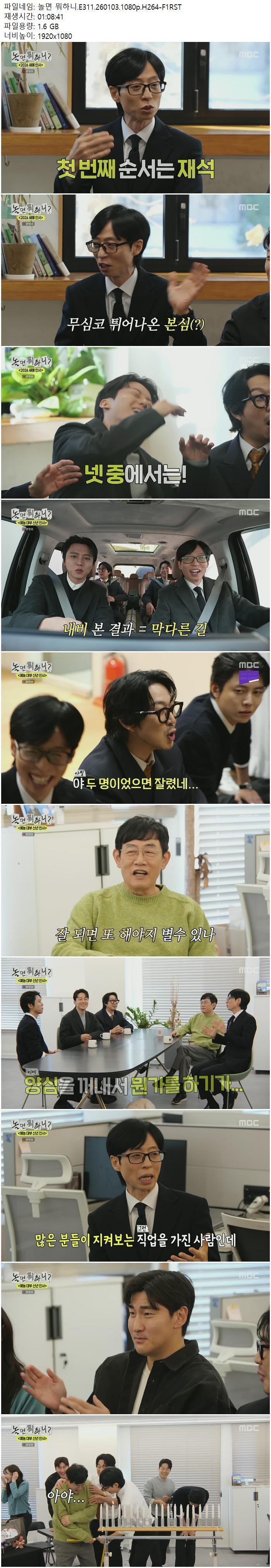 | 놀면 뭐하니.E311.260103.1080p.H264-F1RST.mp4 | 1.6 G | 01:08:41 | 1920x1080 |