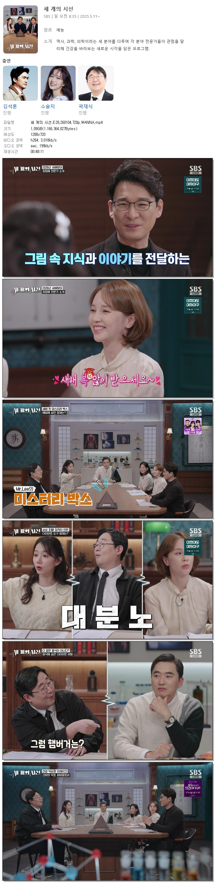 | [SBS] 세 개의 시선.E28.260104.720p.WANNA[김석훈, 소슬지].mp4 | 1.1 G | 00:48:11 | 1280x720 |