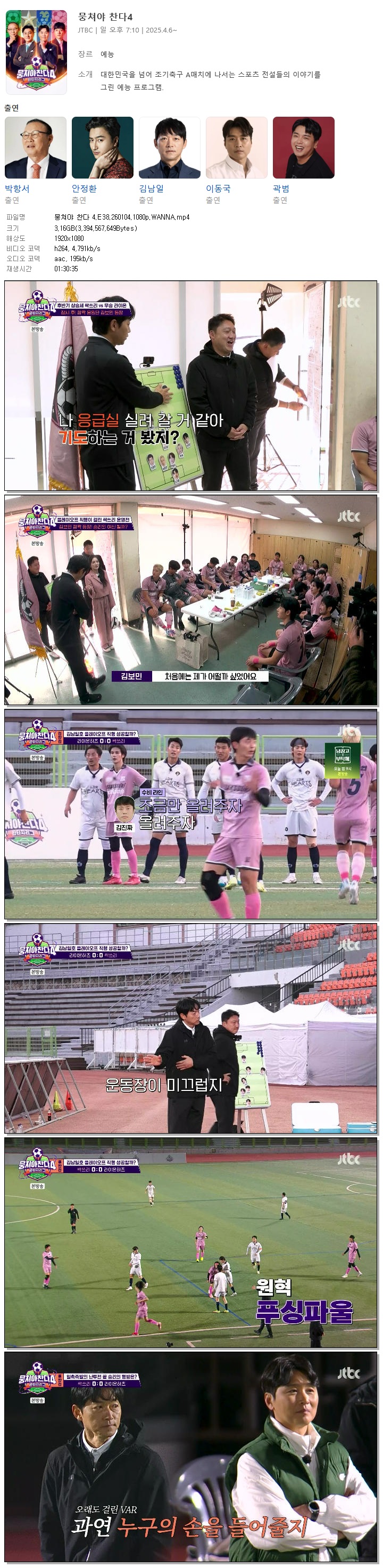 | [JTBC] 뭉쳐야 찬다 4.E38.260104.1080p.WANNA[김남일, 안정환].mp4 | 3.2 G | 01:30:35 | 1920x1080 |