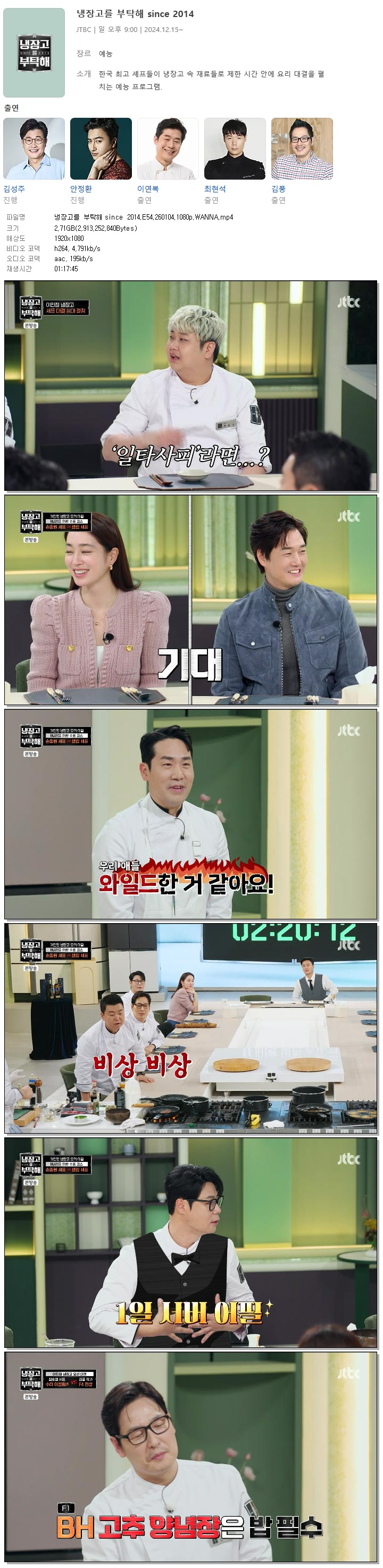| [JTBC] 냉장고를 부탁해 since 2014.E54.260104.1080p.WANNA[이민정, 유지태].mp4 | 2.7 G | 01:17:45 | 1920x1080 |