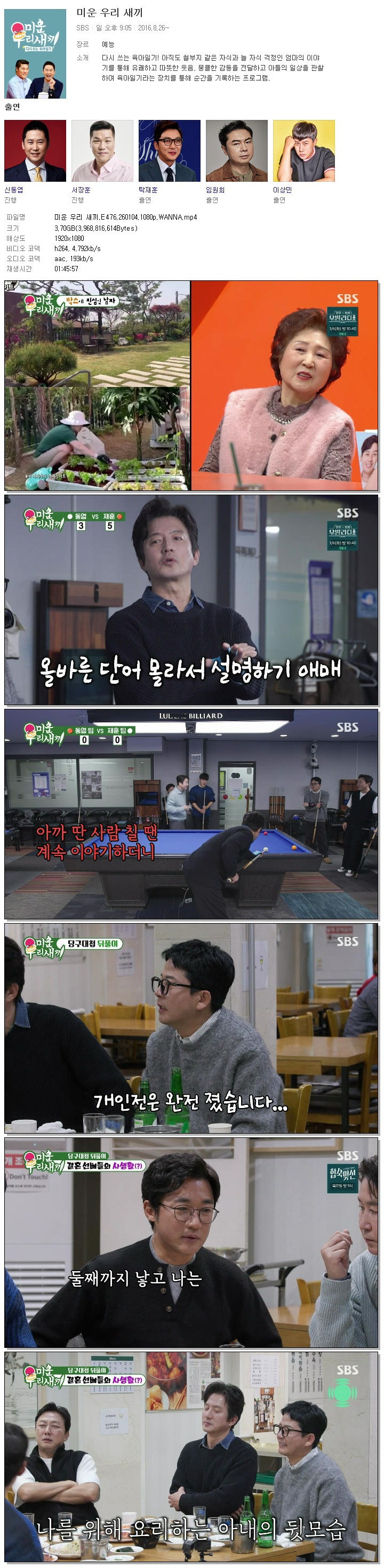 | [SBS] 미운 우리 새끼.E476.260104.1080p.WANNA[신동엽, 탁재훈].mp4 | 3.7 G | 01:45:57 | 1920x1080 |