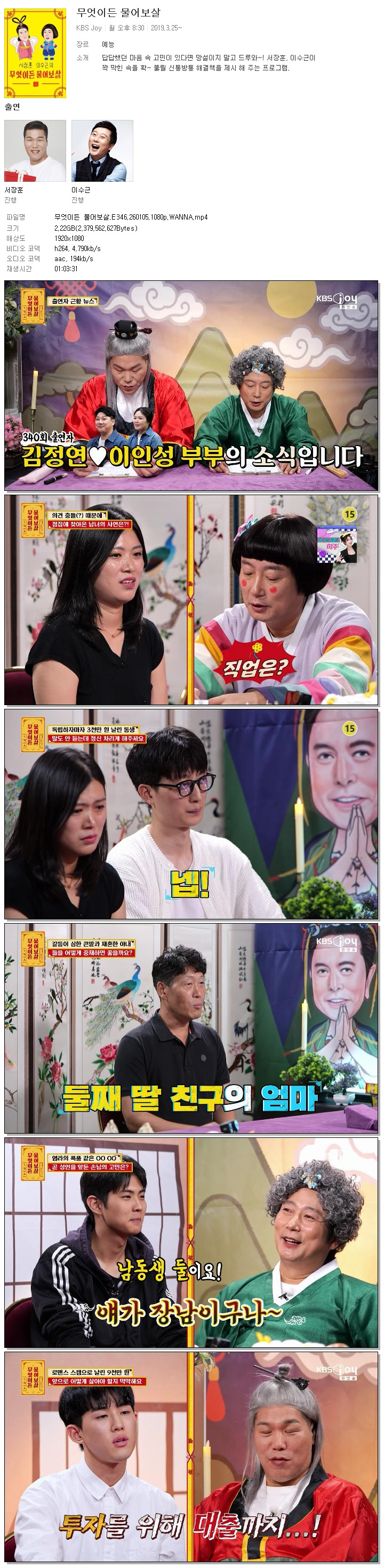 | [KBS JOY] 무엇이든 물어보살.E346.260105.1080p.WANNA[서장훈, 이수근].mp4 | 2.2 G | 01:03:31 | 1920x1080 |